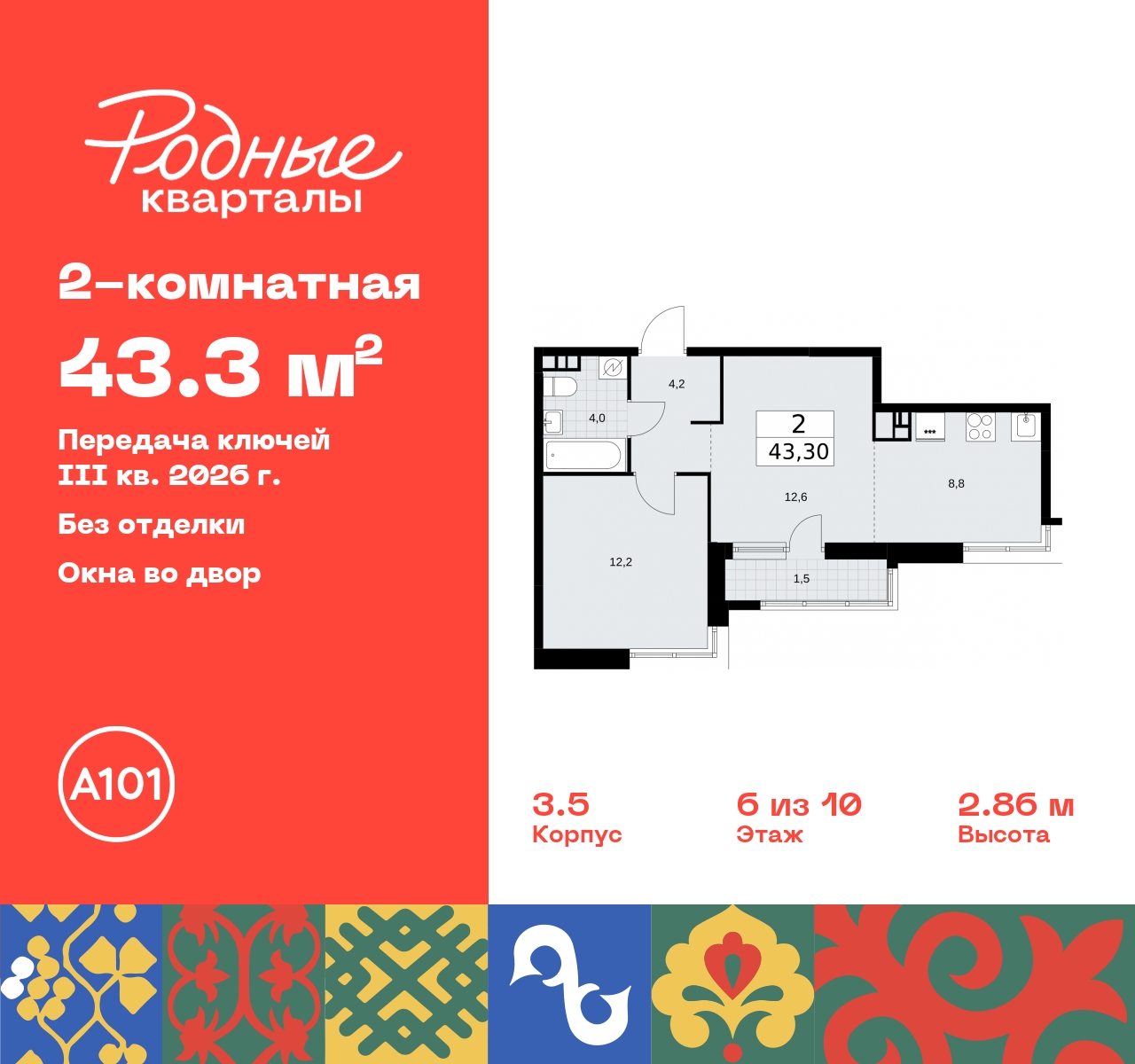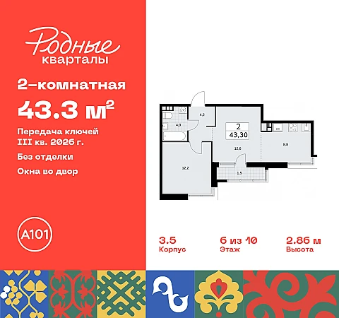 Двухкомнатная квартира с европланировкой в ЖК "Родные кварталы" на 6 этаже. Квартира без отделки, полностью готова к ремонту. Общая площадь: 43.3 кв.м., жилая: 24.8 кв.м., суммарная площадь гостиной-столовой с кухонной зоной: 21.4 кв.м. Европланировка, за счет большой площади кухни-гостиной квартира выглядит просторной и очень удобна для жизни. Комнаты изолированные, все окна выходят на одну сторону. В квартире одна лоджия, один совмещенный санузел. Высота потолков 2.95 м.