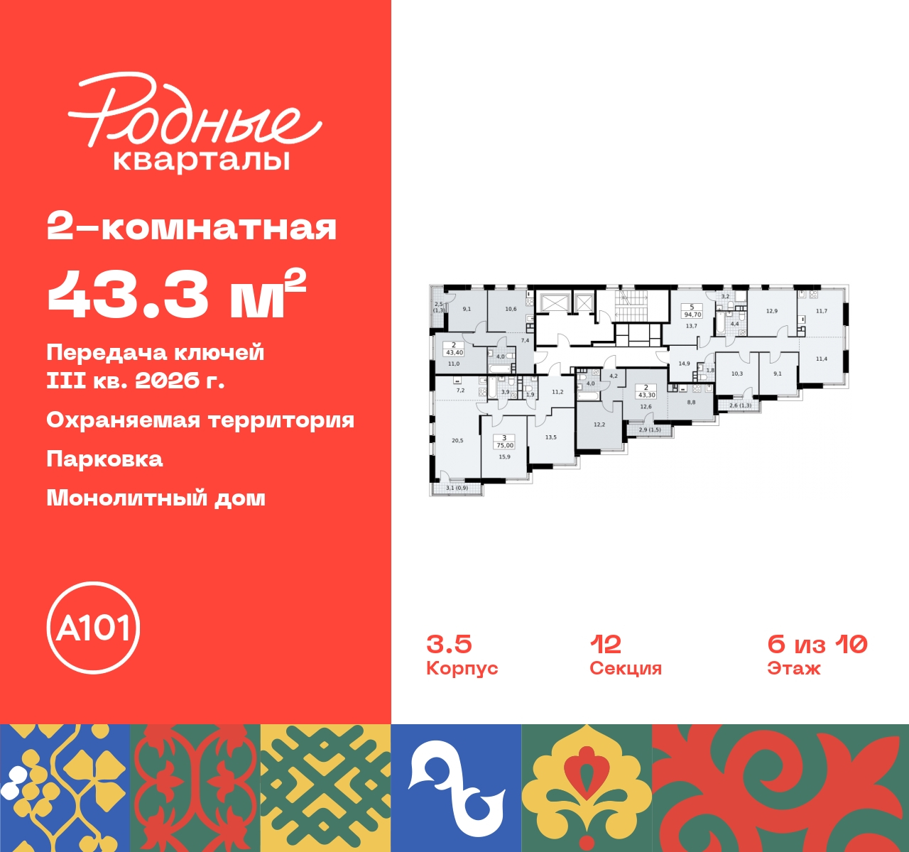 Купить 2к квартиру 43 м² в ЖК "Родные кварталы"