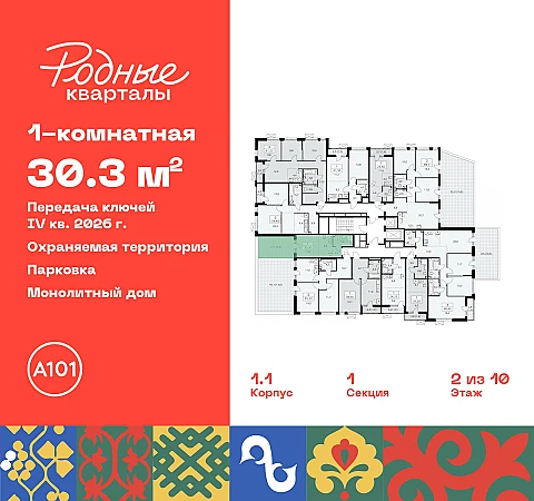 Квартира находится в корпусе 1.1. Дом монолитный, одноподъездный, высотой 10 этажей. На этаже 11 квартир. В подъезде 1 пассажирский и 1 грузовой лифт. Начало строительства - 4 квартал 2023 года. Окончание строительства - 4 квартал 2026 года. Оформление сделки по договору долевого участия.