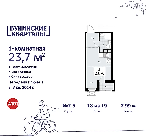 Просторная однокомнатная квартира-студия в ЖК "Бунинские кварталы" на 18 этаже. Квартира без отделки, после выдачи ключей можно делать ремонт. Общая площадь: 23.8 кв.м., площадь гостиной 15.5 кв.м., из которых 7.4 кв.м. выделено под кухонную зону. Все окна выходят на одну сторону. В квартире одна лоджия, один совмещенный санузел. Высота потолков 2.99 м.