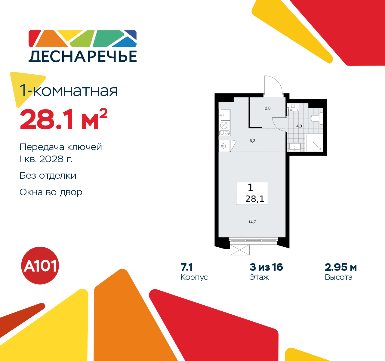 Просторная однокомнатная квартира-студия в ЖК "Деснаречье" на 3 этаже. Квартира без отделки, после получения ключей можно делать ремонт. Общая площадь: 28.1 кв.м., площадь гостиной 21 кв.м., из которых 6.3 кв.м. выделено под кухонную зону. Все окна выходят на одну сторону. В квартире один совмещенный санузел. Высота потолков 2.95 м.