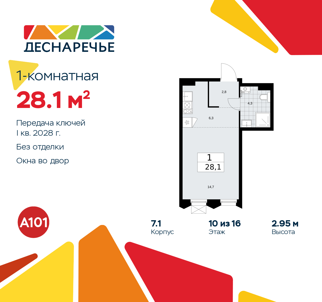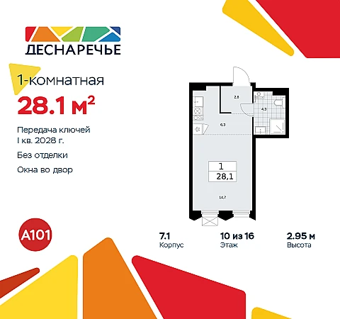 1-комн. квартира-студия в ЖК "Деснаречье" на 10 этаже. Квартира без отделки, полностью готова к чистовой отделке и дальнейшему ремонту. Общая площадь: 28.1 кв.м., площадь гостиной 21 кв.м., из которых 6.3 кв.м. выделено под кухонную зону. Все окна выходят на одну сторону. В квартире один совмещенный санузел. Высота потолков 2.95 м.