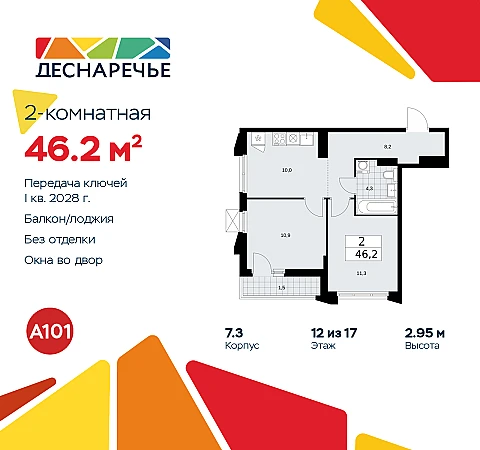 Двухкомнатная квартира в ЖК "Деснаречье" на 12 этаже. Квартира без отделки, после выдачи ключей можно делать ремонт. Общая площадь: 46.2 кв.м., жилая: 22.2 кв.м., площадь просторной кухни-столовой: 10 кв.м. Угловая квартира, идеально подойдет любителям тишины и панорамных видов. В квартире одна лоджия, один совмещенный санузел. Высота потолков 2.95 м.