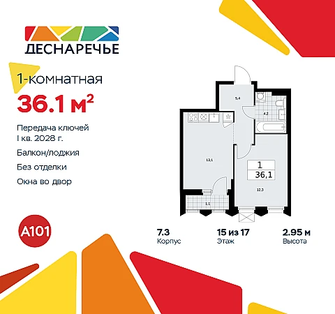 1-комн. квартира от застройщика в ЖК "Деснаречье" на 15 этаже. Квартира без отделки, полностью готова к ремонту. Общая площадь: 36.1 кв.м., жилая: 12.3 кв.м., площадь просторной кухни-столовой: 13.1 кв.м. Все окна выходят на одну сторону. В квартире одна лоджия, один совмещенный санузел. Высота потолков 2.95 м.