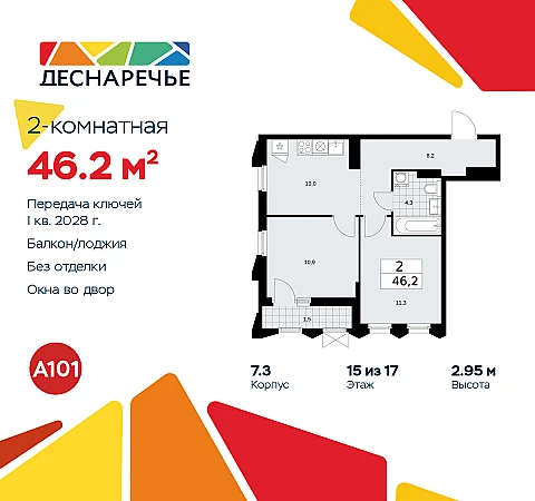 Двухкомнатная квартира в ЖК "Деснаречье" на 15 этаже. Квартира без отделки, после оформления собственности можно делать ремонт. Общая площадь: 46.2 кв.м., жилая: 22.2 кв.м., площадь просторной кухни-столовой: 10 кв.м. Квартира угловая, окна oбecпeчивaют paвнoмepнoe ocвeщeниe в тeчeниe дня. В квартире одна лоджия, один совмещенный санузел. Высота потолков 2.95 м.