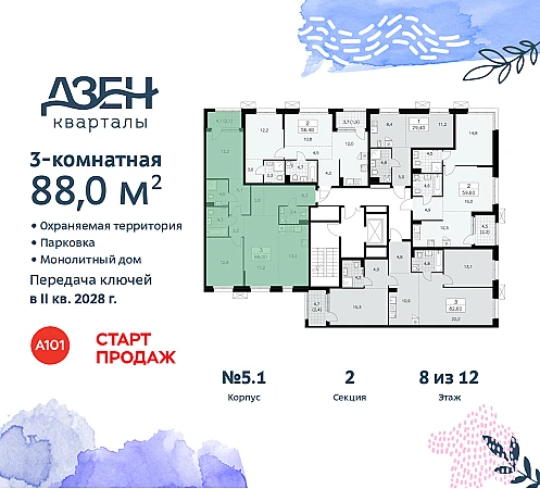 Купить 3к квартиру 88 м² в ЖК "Дзен-кварталы"