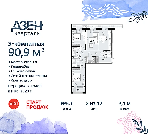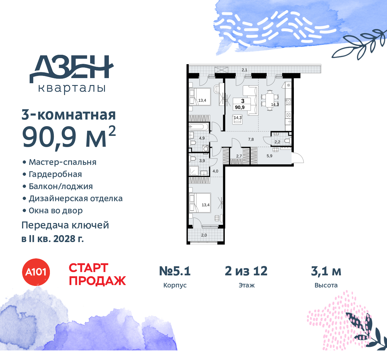 Купить 3к квартиру 90 м² в ЖК "Дзен-кварталы"