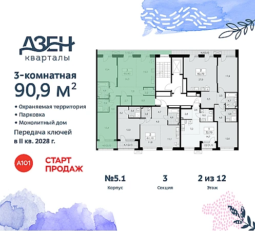 Продается трехкомнатная квартира бизнес-класса с европланировкой и отделкой в ЖК "Дзен-кварталы" на 2 этаже. Общая площадь: 90.9 кв.м., жилая: 41.1 кв.м., общая площадь гостиной-столовой с кухонной зоной: 28.6 кв.м. Европланировка, зона гостиной комнаты объединена с кухней. Квартира - распашонка, без проходных комнат, окна выходят на paзные стороны дома. В квартире два балкона, два совмещенных санузла. Высота потолков 3.1 м.