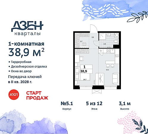 1-комн. квартира бизнес-класса-студия с отделкой в ЖК "Дзен-кварталы" на 5 этаже. Общая площадь: 38.9 кв.м., площадь гостиной 27.8 кв.м., из которых 13.1 кв.м. выделено под кухонную зону. Все окна выходят на одну сторону. В квартире один совмещенный санузел. Высота потолков 3.1 м.
