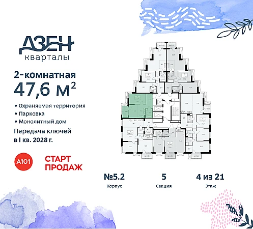 Квартира находится в корпусе 5.2. Дом монолитный, одноподъездный, высотой 21 этаж. На этаже 6 квартир. В подъезде 1 пассажирский и 2 грузовых лифта. Начало строительства - 3 квартал 2025 года. Окончание строительства - 1 квартал 2028 года. Оформление сделки по договору долевого участия.