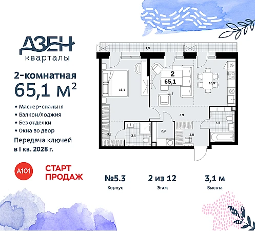 Купить 2к квартиру 65 м² в ЖК "Дзен-кварталы"