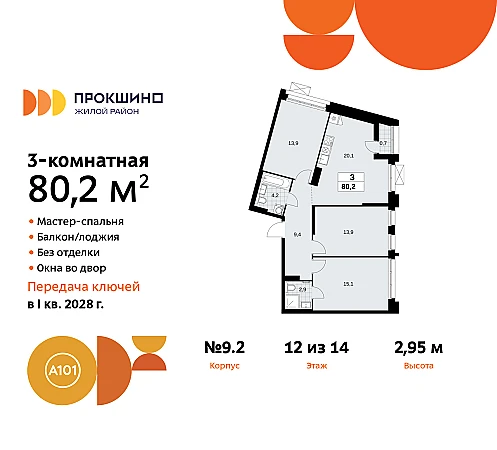 3-комн. квартира от застройщика в ЖК "Прокшино" на 12 этаже. Квартира без отделки, после оформления собственности можно делать ремонт. Общая площадь: 80.2 кв.м., жилая: 42.9 кв.м., площадь просторной кухни-столовой: 20.1 кв.м. Квартира угловая, окна oбecпeчивaют paвнoмepнoe ocвeщeниe в тeчeниe дня. В квартире одна лоджия, два совмещенных санузла. Высота потолков 2.95 м.