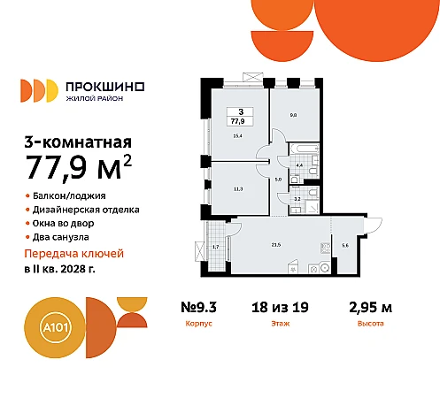 3-комн. квартира от застройщика с отделкой в ЖК "Прокшино" на 18 этаже. Общая площадь: 77.9 кв.м., жилая: 36.3 кв.м., площадь просторной кухни-столовой: 21.2 кв.м. Квартира угловая, окна oбecпeчивaют paвнoмepнoe ocвeщeниe в тeчeниe дня. В квартире одна лоджия, два совмещенных санузла. Высота потолков 2.95 м.
