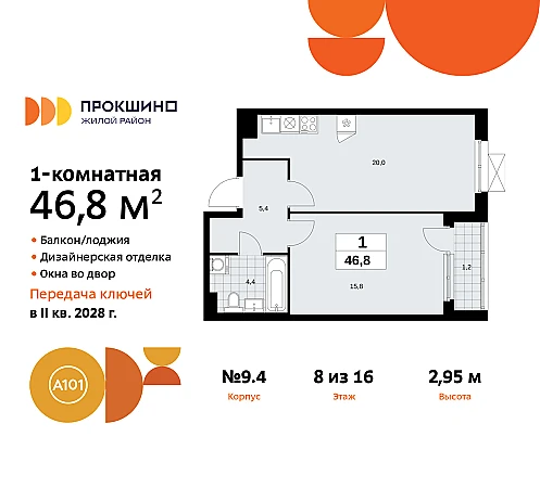 Продается однокомнатная квартира с отделкой в ЖК "Прокшино" на 8 этаже. Общая площадь: 46.8 кв.м., жилая: 15.8 кв.м., площадь просторной кухни-столовой: 20 кв.м. Все окна выходят на одну сторону. В квартире одна лоджия, один совмещенный санузел. Высота потолков 2.95 м.