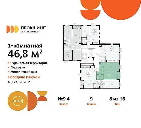 Дом монолитный, черырехподъездный, переменной этажности, от 10 до 16 этажей. Квартира находится во 2-й секции высотой 10 этажей в корпусе 9.4. На этаже 6 квартир. В подъезде 1 грузовой лифт. Начало строительства - 3 квартал 2025 года. Окончание строительства - 4 квартал 2027 года. Оформление сделки по договору долевого участия.