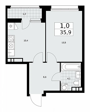 Однокомнатная квартира от застройщика с предчистовой отделкой в ЖК "Дзен-кварталы" на 6 этаже. Общая площадь: 35.9 кв.м., жилая: 13.5 кв.м., площадь просторной кухни-столовой: 10.4 кв.м. Все окна выходят на одну сторону. В квартире одна лоджия, один совмещенный санузел. Высота потолков 2.95 м.