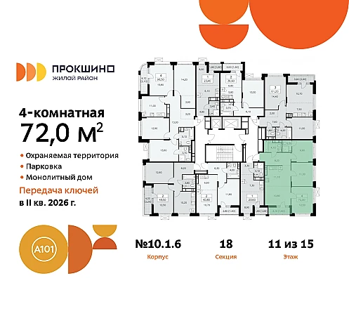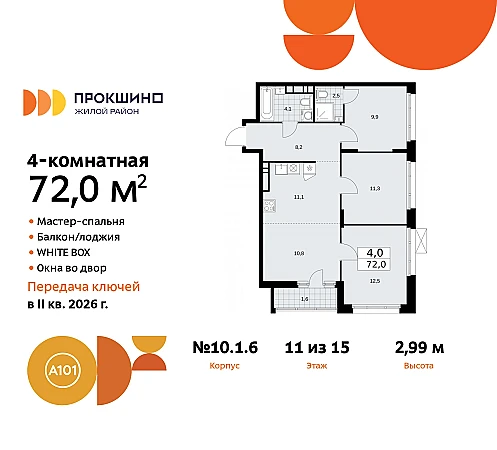4-комн. квартира с предчистовой отделкой в ЖК "Прокшино" на 11 этаже. Общая площадь: 71.7 кв.м. Высота потолков 2.99 м.