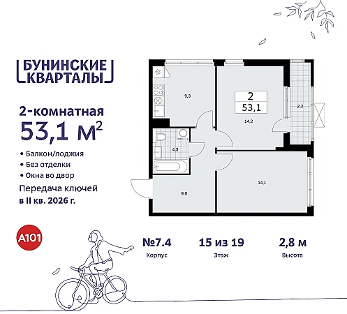 Двухкомнатная квартира в ЖК "Бунинские кварталы" на 15 этаже. Квартира без отделки, после оформления собственности можно делать ремонт. Общая площадь: 53 кв.м. Высота потолков 2.8 м.