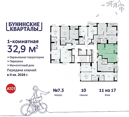 Купить 1к квартиру 32 м² в ЖК "Бунинские кварталы"