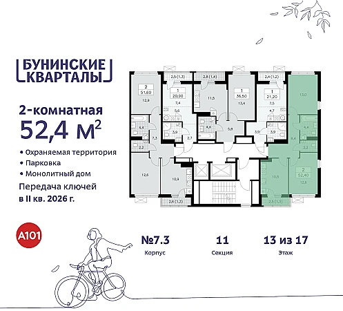 2-комн. квартира от застройщика в ЖК "Бунинские кварталы" на 13 этаже. Квартира без отделки, новый владелец может сделать ремонт по индивидуальному проекту. Общая площадь: 52.2 кв.м. Высота потолков 2.8 м.