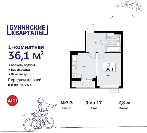 Однокомнатная квартира в ЖК "Бунинские кварталы" на 9 этаже. Квартира без отделки, полностью готова к ремонту. Общая площадь: 36 кв.м. Высота потолков 2.8 м.