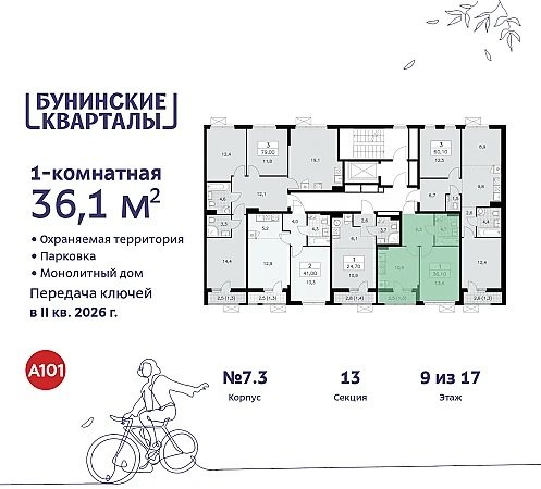Купить 1к квартиру 36 м² в ЖК "Бунинские кварталы"