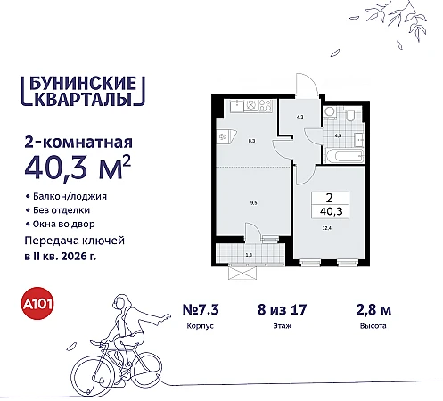 Просторная 2-комн. квартира с европланировкой в ЖК "Бунинские кварталы" на 8 этаже. Квартира без отделки, после получения ключей можно делать ремонт. Общая площадь: 40.4 кв.м., жилая: 21.9 кв.м., общая площадь гостиной-столовой с кухонной зоной: 17.9 кв.м. Европейская планировка, за счет большой площади кухни-гостиной квартира выглядит просторной и очень удобна для жизни. Комнаты изолированные, все окна выходят на одну сторону. В квартире одна лоджия, один совмещенный санузел. Высота потолков 2.8 м.