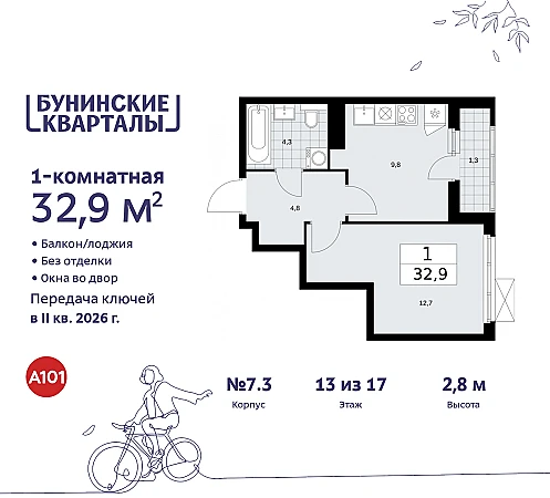 Продается однокомнатная квартира в ЖК "Бунинские кварталы" на 13 этаже. Квартира без отделки, полностью готова к чистовой отделке и дальнейшему ремонту. Общая площадь: 32.8 кв.м. Высота потолков 2.8 м.