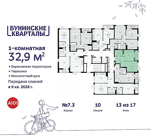 Купить 1к квартиру 32 м² в ЖК "Бунинские кварталы"
