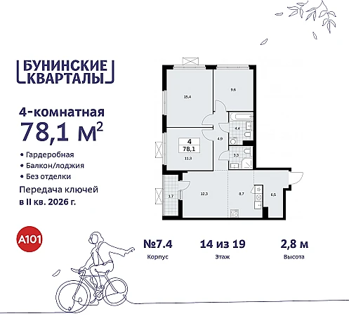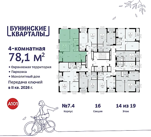 Купить 4к квартиру 78 м² в ЖК "Бунинские кварталы"