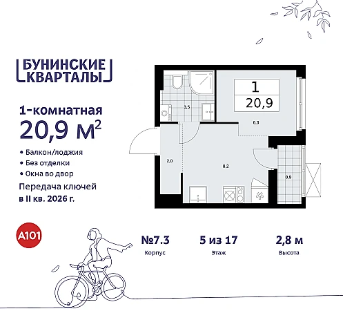 1-комн. квартира-студия в ЖК "Бунинские кварталы" на 5 этаже. Квартира без отделки, после выдачи ключей можно делать ремонт. Общая площадь: 20.8 кв.м. Высота потолков 2.8 м.