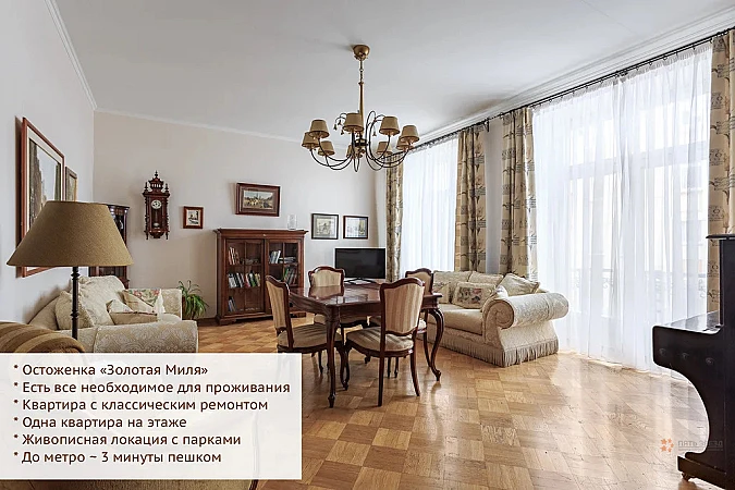Сдаётся 4-комнатная квартира по адресу: Москва, ул. Остоженка, 5 - один из самых престижных районов столицы. Дом культурного наследия, атмосфера дореволюционной Москвы - при этом квартира полностью адаптирована под современный уровень комфорта.