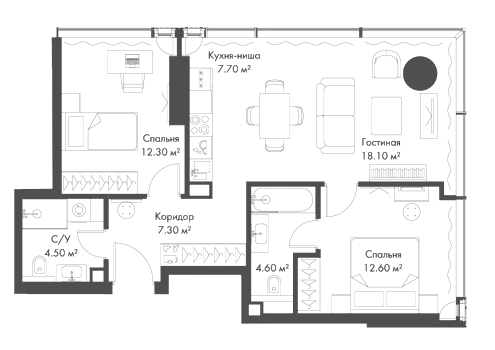 . В жилой зоне 2 больших окна на одну сторону, хорошая инсоляция.