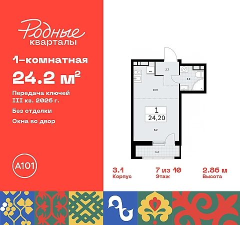 Продается однокомнатная квартира-студия от застройщика в ЖК "Родные кварталы" на 7 этаже. Квартира без отделки, новый владелец может сделать ремонт по индивидуальному дизайн-проекту. Общая площадь: 24.2 кв.м., площадь гостиной 17.1 кв.м., из которых 6.1 кв.м. выделено под кухонную зону. Все окна выходят на одну сторону. В квартире один балкон, один совмещенный санузел. Высота потолков 2.95 м.
