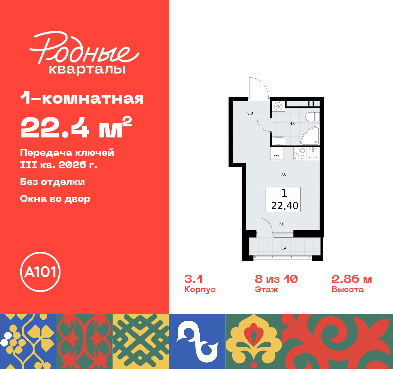 Просторная однокомнатная квартира-студия в ЖК "Родные кварталы" на 8 этаже. Квартира без отделки, полностью готова к чистовой отделке и дальнейшему ремонту. Общая площадь: 22.4 кв.м., площадь гостиной 14 кв.м., из которых 7 кв.м. выделено под кухонную зону. Все окна выходят на одну сторону. В квартире один балкон, один совмещенный санузел. Высота потолков 2.95 м.
