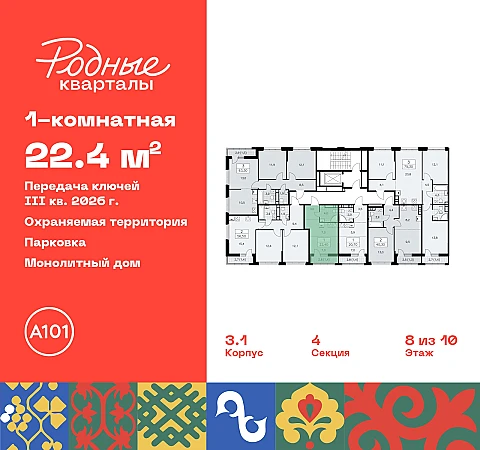 Дом монолитный, черырехподъездный, высотой 10 этажей. Квартира находится в 4-й секции в корпусе 3.1. На этаже 6 квартир. В подъезде 1 грузовой лифт. Начало строительства - 2 квартал 2024 года. Окончание строительства - 3 квартал 2026 года. Оформление сделки по договору долевого участия.
