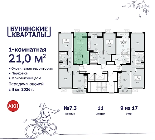 Купить 1к квартиру 21 м² в ЖК "Бунинские кварталы"