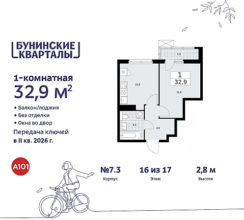 Купить 1к квартиру 32 м² в ЖК "Бунинские кварталы"