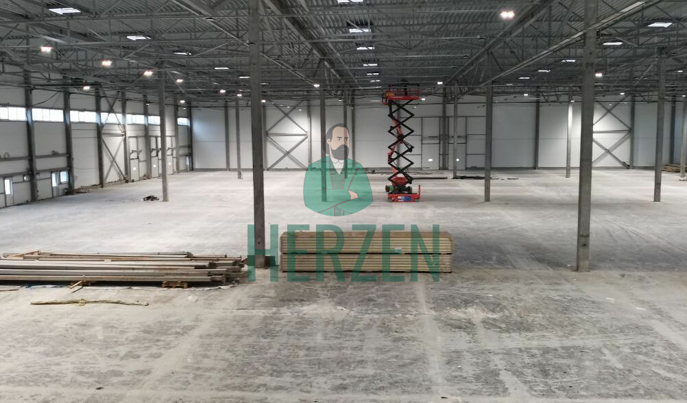 Ровный бетонный пол с антипылевым покрытием. Допустимая нагрузка на пол 7,5 т/м2