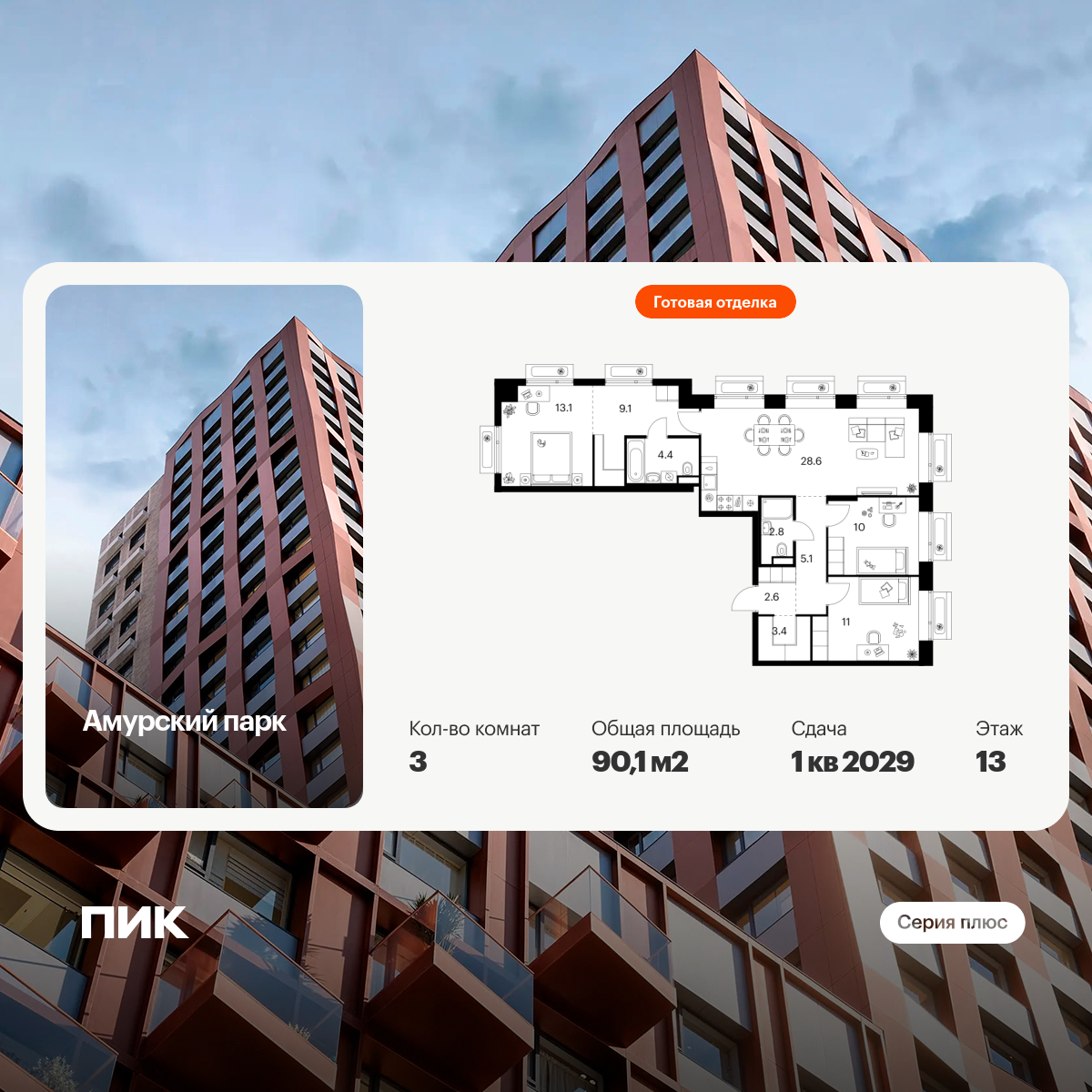 Купить 3к квартиру 88 м² в ЖК Зелёный Парк