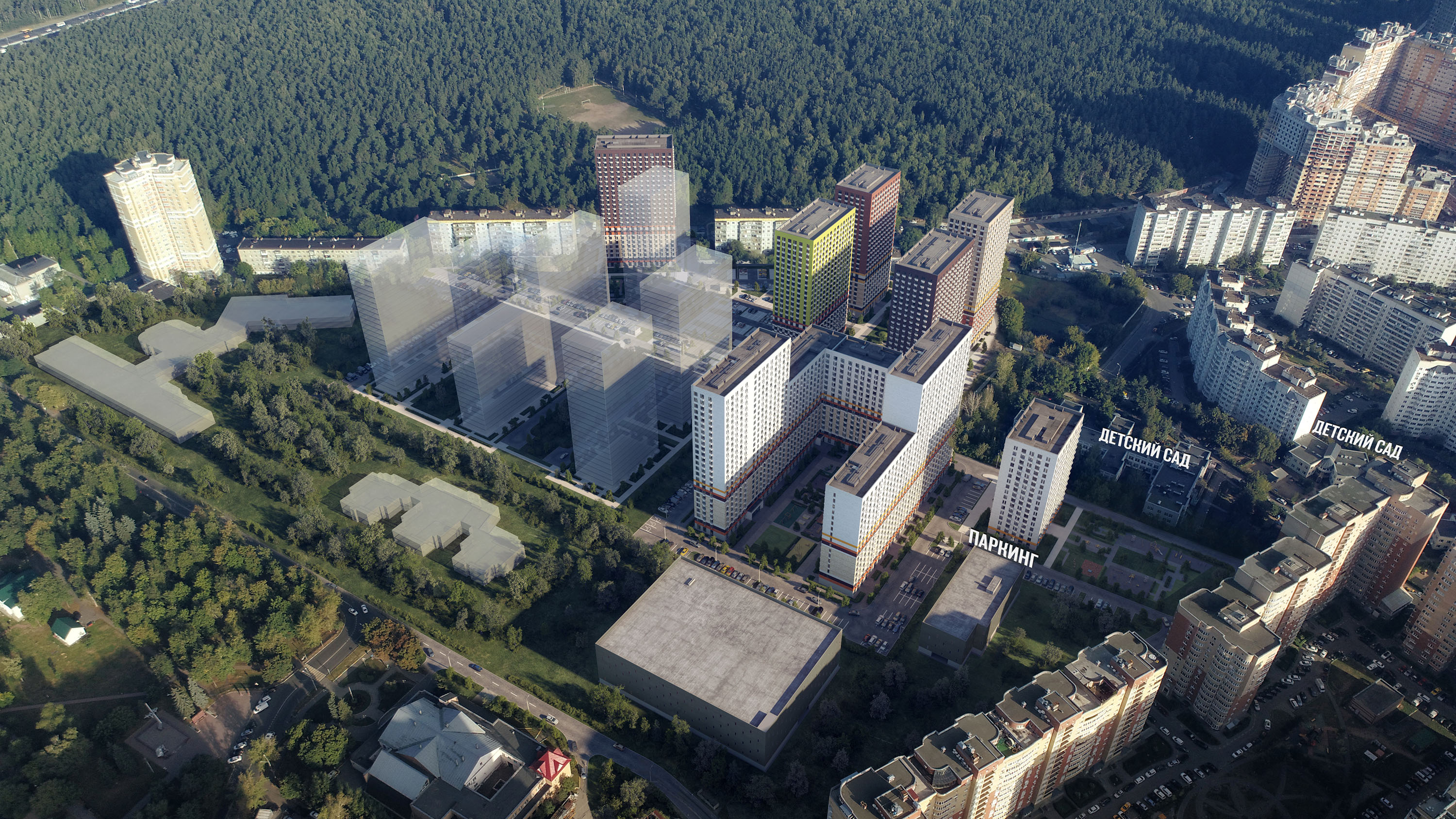 На территории квартала появятся два детских сада с бассейном и подземный паркинг. Всего в минуте ходьбы от проекта откроется школа для 1000 учеников. Во дворах мы построим уютные парки с местами для отдыха и детскими площадками. А на первых этажах домов появятся кафе, магазины и полезные сервисы.