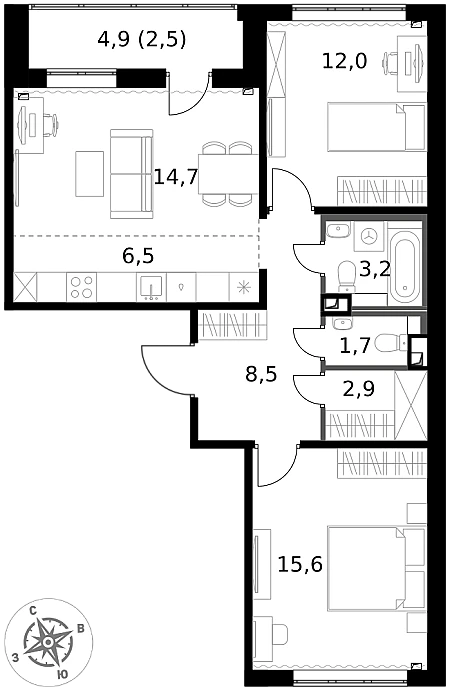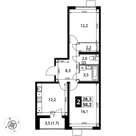 Площадь квартиры - 58,4 м2. Распашонка: три изолированных комнаты 12,6 м2, 11,6 м2, 18 м2. Из окна красивый вид, очень зелено, тихо и спокойно. Есть застекленная лоджия.