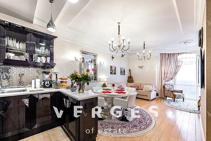 3-х комнатная квартира площадью 102 кв.м., с отделкой в современном стиле, полностью оборудована встраиваемой бытовой техникой и мебелью от ведущих производителей. Планировка: 2 спальные комнаты (одна из которых зонируется на кабинет и спальную), просторная кухня-гостиная, гардеробная, 2 санузла. Прекрасные панорамные виды на Тропарево-Никулинский парк. Уютная квартира спроектирована для современной семьи.