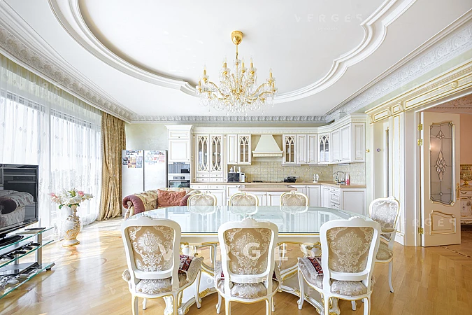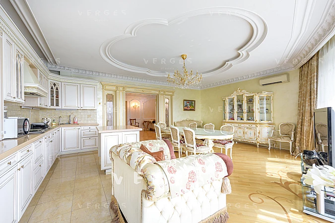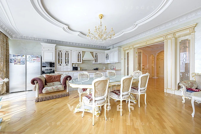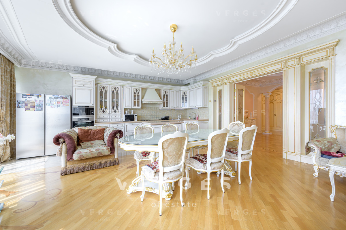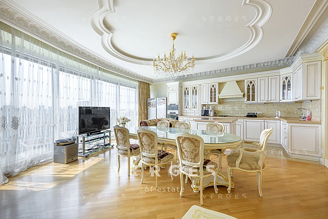 В продажу предлагается 5-ти комнатная квартира в ЖК Миракс Парк. В квартире выполнен качественный ремонт в классическом стиле. В отделке использованы натуральные материалы. Планировка: просторная и светлая кухня-гостиная с панорамным остеклением, 4 спальные комнаты, 3 просторных совмещенных санузла, постирочная, прихожая и гардеробная комната, отдельная кладовая комата. Большое количество мест для хранения. Вся мебель и техника от ведущих европейских производителей. Сплит-система, теплые полы. Оперативный показ.