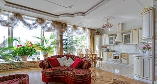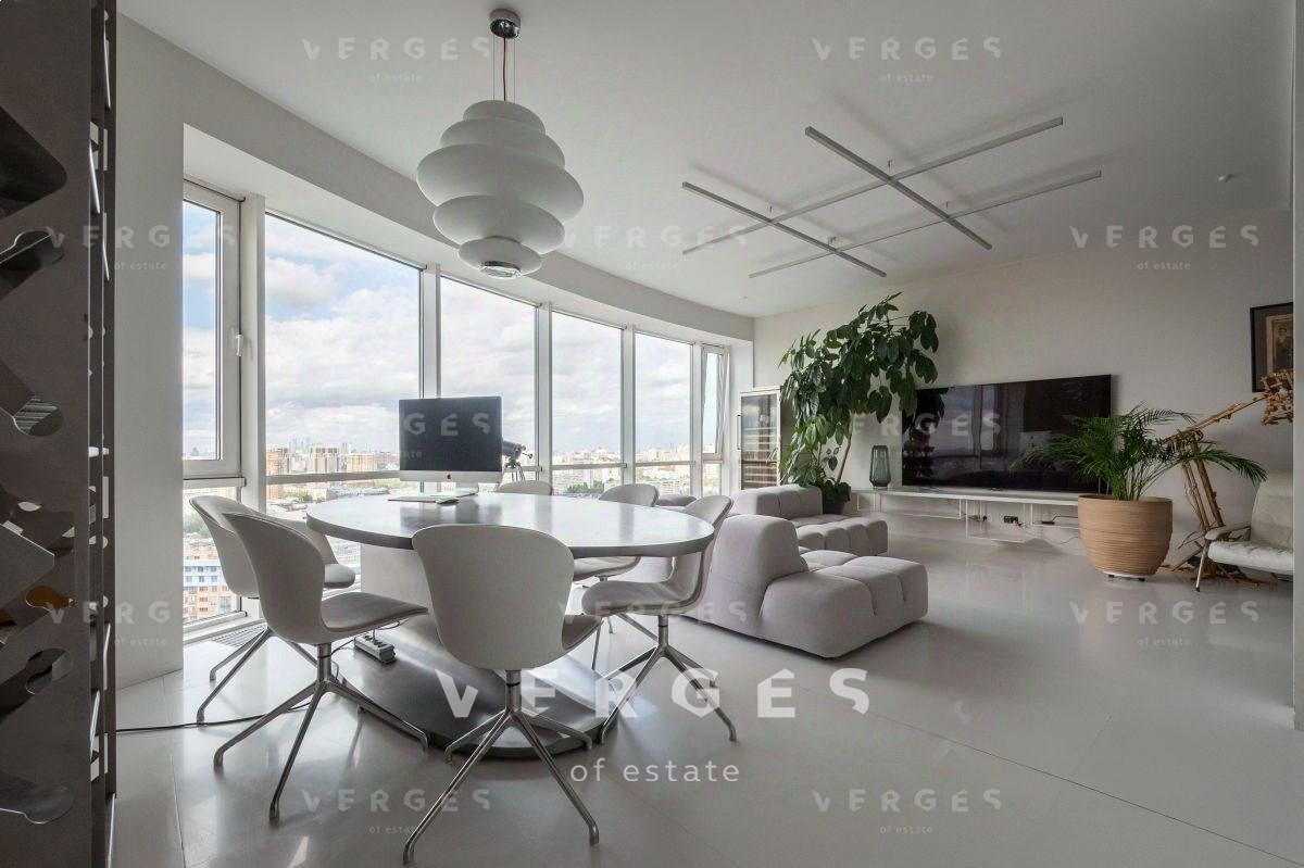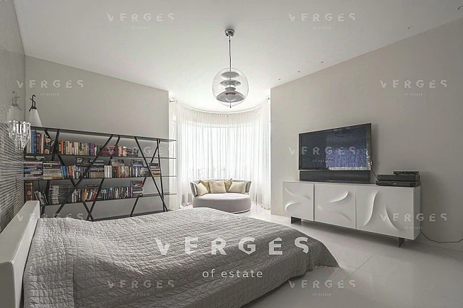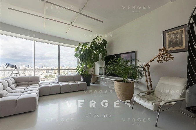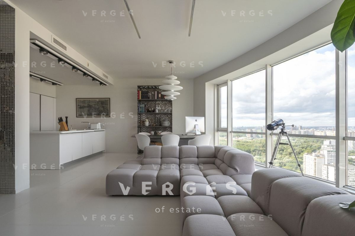 В продажу предлагается двухуровневая 5и комнатная квартира с дизайнерским ремонтом. Первый этаж: Просторная кухня-гостиная-столовая, спальная комната с кабинетом, санузел с ванной и душевой кабиной, гардеробная и гостевой санузел. Второй этаж: две спальни, гардеробная и санузел. Окна квартиры выходят на пруд, ландшафтную территорию комплекса и Тропаревский лесопарк. В квартире сделан уникальный, дизайнерский ремонт с использованием самых дорогих отделочных материалов. Кухонный гарнитур оборудован всей необходимой премиальной бытовой техникой KUPPERSBUSCH. Стиральная и сушильная машины MIELE. Санузлы отделаны белым каррарским мрамором. Многие предметы мебели и детали интерьера были изготовлены индивидуально. Квартира полностью меблирована и готова к заселению.
