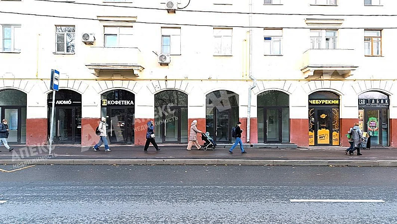 Интенсивный пешеходный трафик, первая линия, рядом расположены наземный пешеходный переход и остановка общественного транспорта.