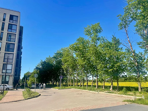 Просторный внутренний двор. На его территории размещаются детские и спортивные площадки, а также пространство для отдыха. Клумбы с цветами, деревья кустарники, малые архитектурные формы.