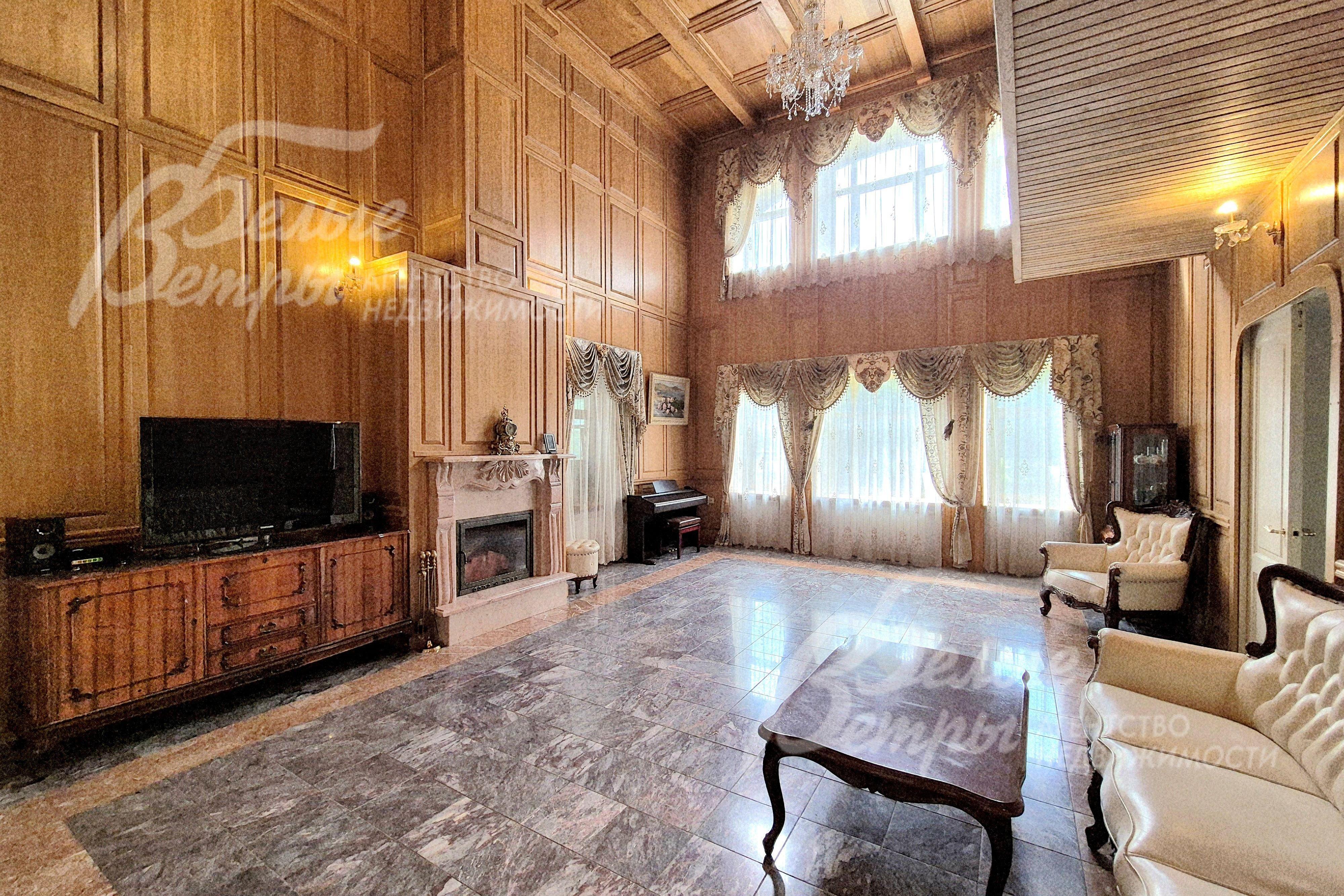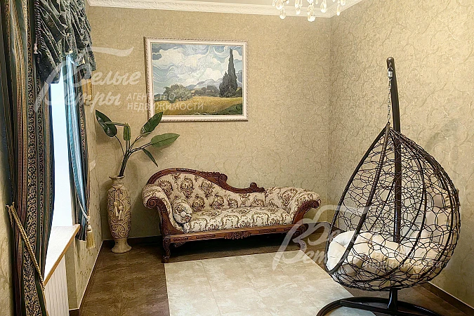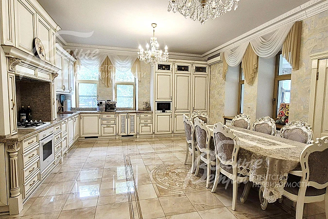 Мебель, оборудование: кухонный гарнитур в классическом стиле со шпонированными фасадами и столешницей из камня (Италия). Встроенная техника: газовая варочная панель, духовой шкаф, микроволновая печь Bosch, посудомоечная машина, двухкамерный холодильник. Телевизоры Philips, Bosch, стиральные машины Samsung и Bosch, сушильная машина Siemens. В гостиной антикварная мебель, в зоне столовой обеденная группа из массива на 8 персон. В спальнях дорогие гарнитуры из массива дерева с резными элементами (двуспальные кровати, прикроватные тумбы, комоды, туалетные столики, банкетки, вместительные шкафные группы). В кабинете кожаный диван, солидный рабочий стол и шкаф для документов из массива. В гардеробных функциональная система хранения. Во всех помещениях дорогие карнизы, шторы с подхватами и ламбрекенами, изящные тюли, оригинальные люстры и светильники. Второй свет украшают хрустальные люстры с имитацией свечей, на стенах разнообразные картины в общей стилистике дома..