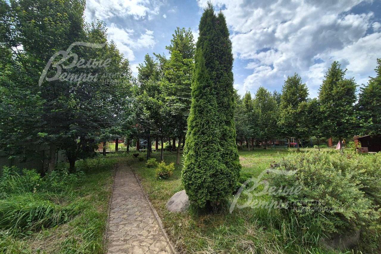 Благоустройство участка: газон, множество лесных деревьев - липы, сосны, ель, пихта, дуб, клен, каштан, березы, крупномерные туи.