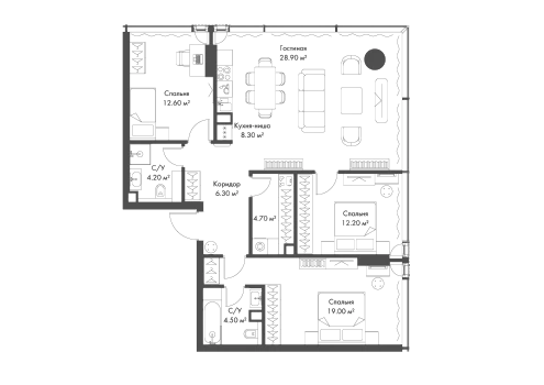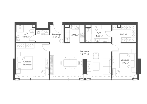 3 совмещенных санузла. В жилой зоне 2 больших окна на одну сторону, хорошая инсоляция.